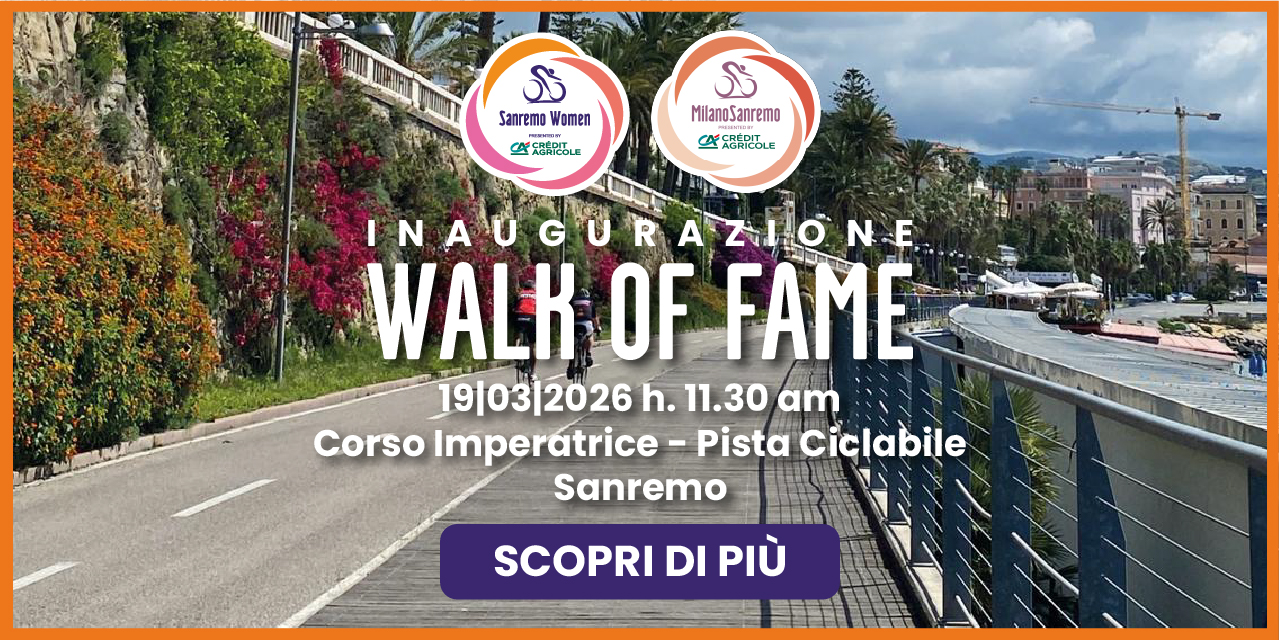 Quest’anno si rafforza ulteriormente il legame tra RCS Sport e il Comune di Sanremo con un’iniziativa destinata a lasciare il segno, in tutti i sensi. Verrà infatti inaugurata la “Walk of Fame”, la passerella delle stelle dedicata ai grandi protagonisti della Classicissima di primavera, simbolo del ciclismo italiano nel mondo.